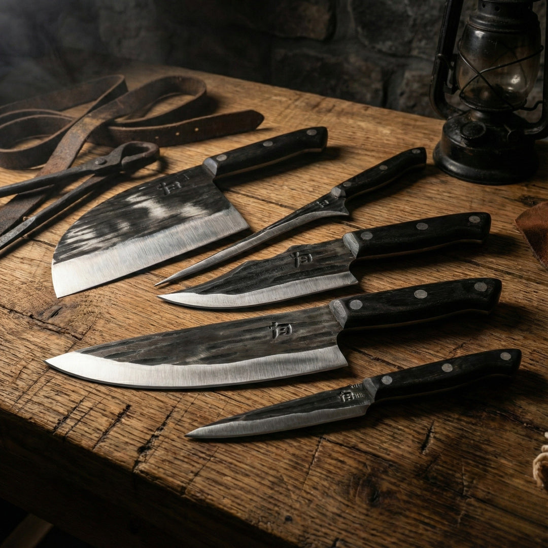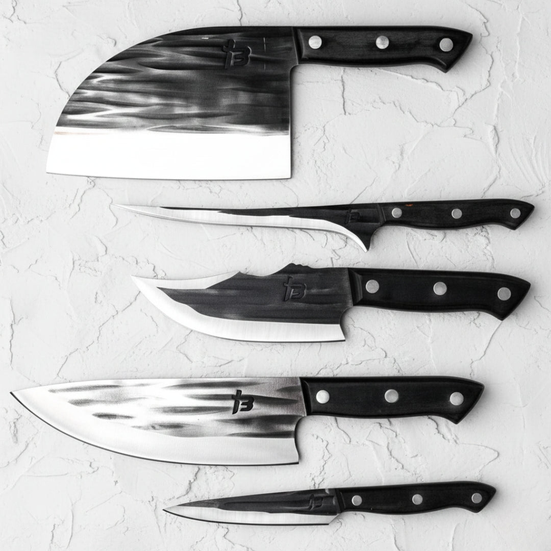 The Midnight Series 5-Piece Set is built for the bold, featuring rugged blades with striking black forge marks and sleek black Pakka Wood handles. This collection includes the powerhouse 8" Chef Knife, the versatile 7" Serbian Cleaver, the precise 6" Fillet Knife, the multi-tasking 6" Utility Knife, and the nimble 3.5" Petty Knife. Designed for both durability and performance, these knives deliver exceptional strength and control for every cut.